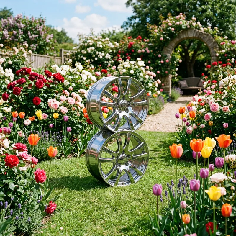 Imagine a serene scene in a lush garden clearing filled with beautiful blooming roses of various shades of red, pink, and white. Alongside the roses, vibrant tulips in hues of orange, yellow, and violet are interspersed, adding to the richness of the tableau. What stands out, however, are two metallic car rims placed uniquely in the form of the number eight. The polishing on these rims gleams in the sunlight, creating a striking contrast with the soft, delicate beauty of the surrounding flowers.