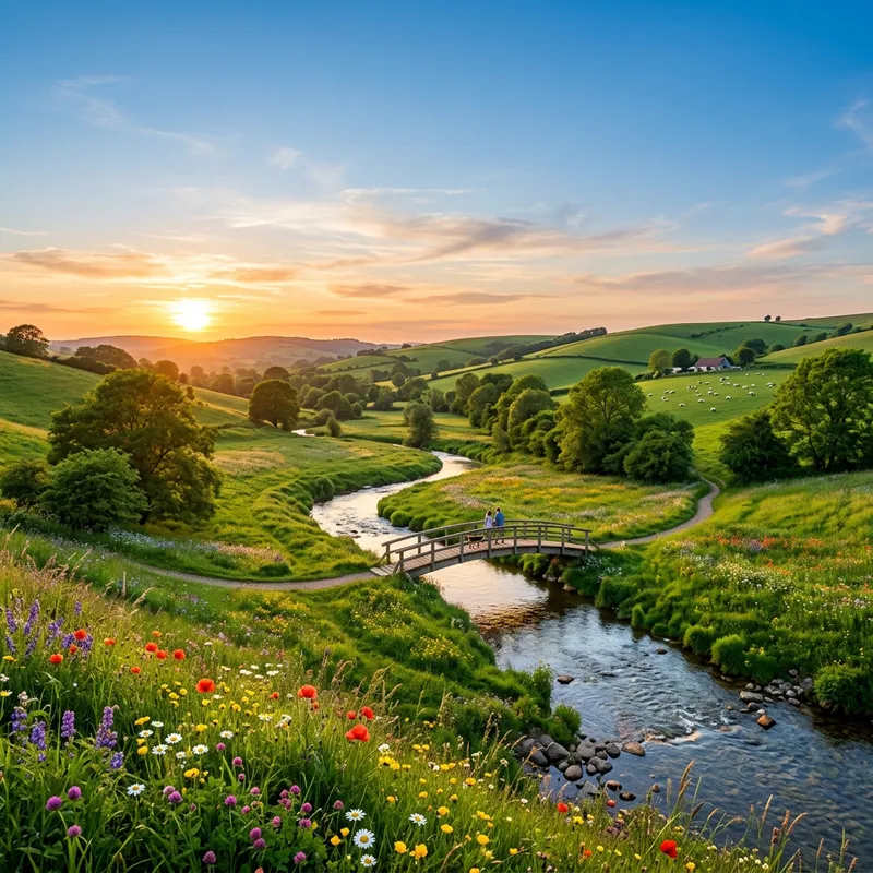 Create a delightful panorama of a serene landscape. Visualize a vibrant rolling green hill under a clear azure sky. A bubbling river gently winding through the grassy meadows; lush, lofty trees peppered throughout the shrubs offering shade. A quaint wooden footbridge crossing over the river. Delicate, vibrant wildflowers carpeting the ground in bursts of color. The warming appearance of a golden sun setting in the background, casting long shadows and bestowing a rich, warm glow over the scene.