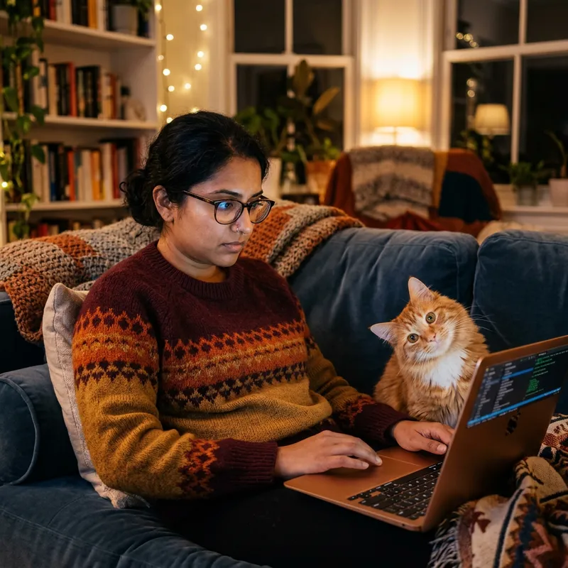 A South Asian woman, who is a cat owner, is comfortably seated on a plush, cozy couch. She gazes intently at a computer screen that illuminates her face casting a bright glow, reflecting her serious and focused expression. Beside her, there is a fluffy, orange tabby cat. It's sitting close to her, glancing with a noticeably curious expression, its eyes wide and its head slightly tilted, creating a cute, pondering look.