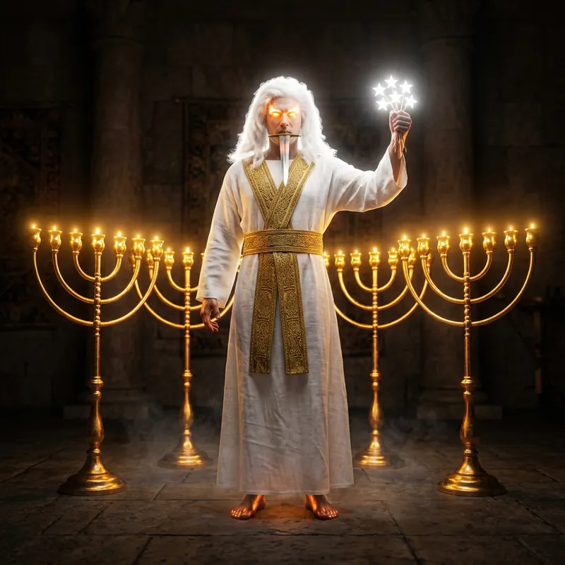 Imagine turning around to notice the source of an intriguing voice. What you find are seven luminescent golden lampstands. Nestled among them is a figure that resembles a human, who is clad in a long robe extending down to their feet, adorned by a golden sash hugging their torso. The figure's hair blooms with the purity of snow, akin to white wool, and their eyes twinkle with intense fire-like radiance. Their feet exhibit the lustrous hue of bronze heated to a glowing state. The voice reverberating from them mirrors the sound of gushing waters. This entity grasps onto seven gleaming stars tightly in their right hand. A pointed, doubly sharp sword extends from their mouth. Their face holds an awe-inspiring brilliance rivalling the radiant sun.