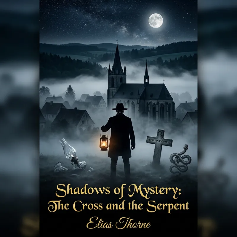 At the top, a starry night sky with a full moon illuminating a dark and mysterious landscape. In the center of the cover, the silhouette of an old village shrouded in fog, with a Gothic church standing out among the buildings. In front of the church, the dark silhouette of a man with a wide-brimmed hat, holding a lantern while looking at the viewer, suggesting the protagonist of the story. Around him, key elements of the mystery: a broken crystal lamp, a cross inscribed with the phrase 'Veritas vincit omnia', and an intertwined snake. At the bottom of the cover, the title of the book in gold, elegant writing: 'Shadows of Mystery: The Cross and the Serpent', accompanied by the name of the author.