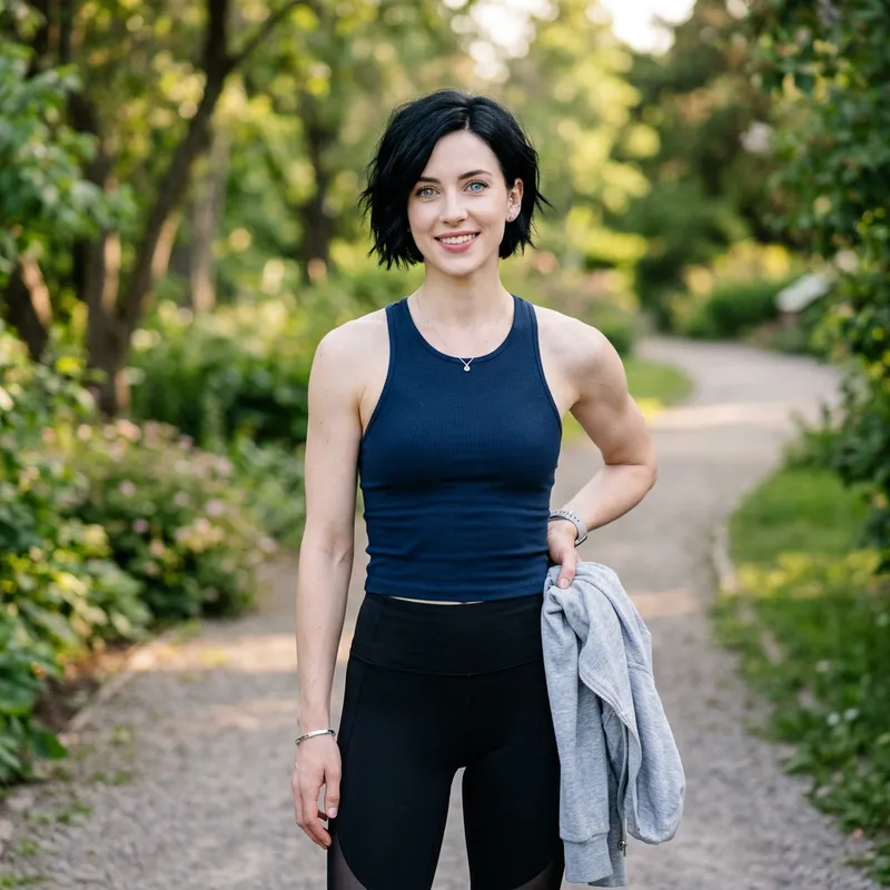 She has pale skin, short black hair, blue eyes, a slender but slightly tone body.