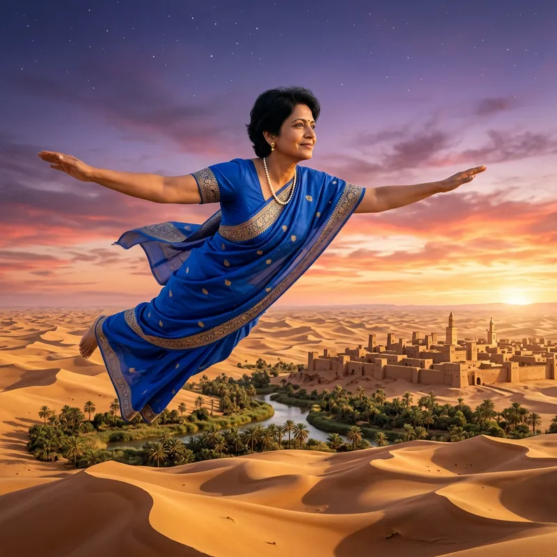 A middle-aged South Asian woman, with short black hair, in a vivid blue sari and a modest pearl necklace. She is depicted in a surreal moment, appearing to fly above a golden landscape at dawn. The backdrop is a sky filled with orange hues fading into purple as stars twinkle faintly farther away. Under her, a panorama of wavy golden sand dunes, an oasis full of palm trees, and a distant walled city can be seen. A look of calm and determination is evident on her face, her arms spread wide as she soars.