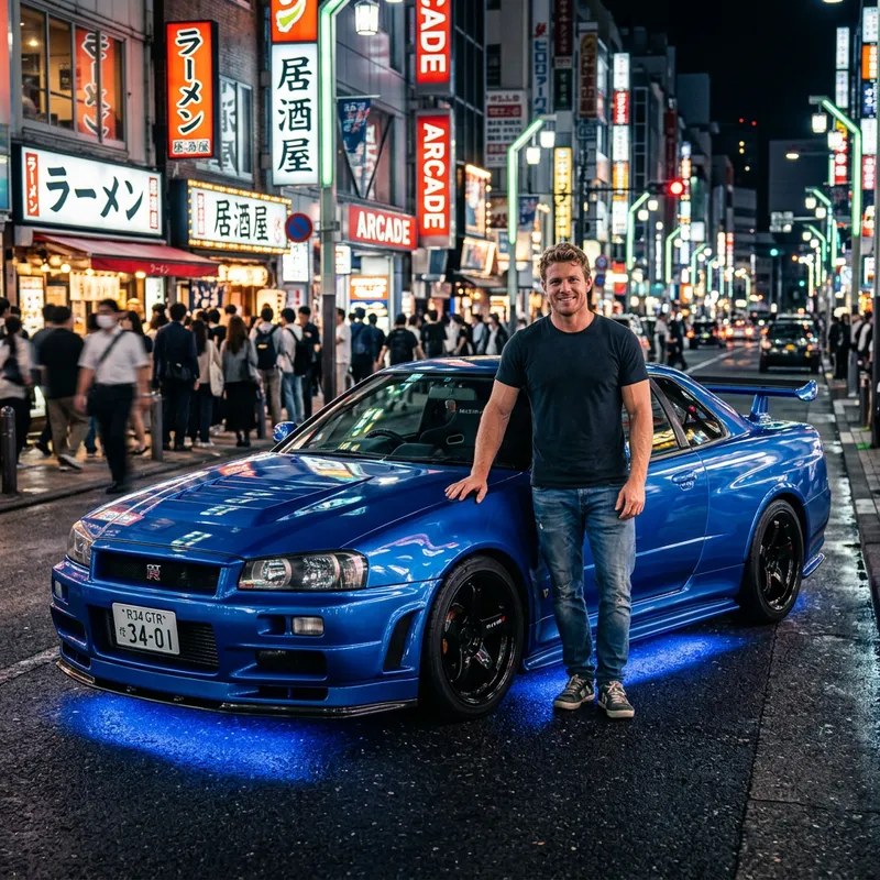 A shiny blue Nissan Skyline R34 with neon lights beneath, similar to the one used by a charismatic character in a famous car-themed movie franchise. The car is parked on a well-lit street at night, while the bustling city nightlife can be seen in the background. A male figure stands next to the car, he is of Caucasian descent, with a muscular build, short blonde hair and wearing casual attire consisting of a short-sleeved shirt and jeans. His pose is relaxed and confident, just as you’d expect from a seasoned street racer.