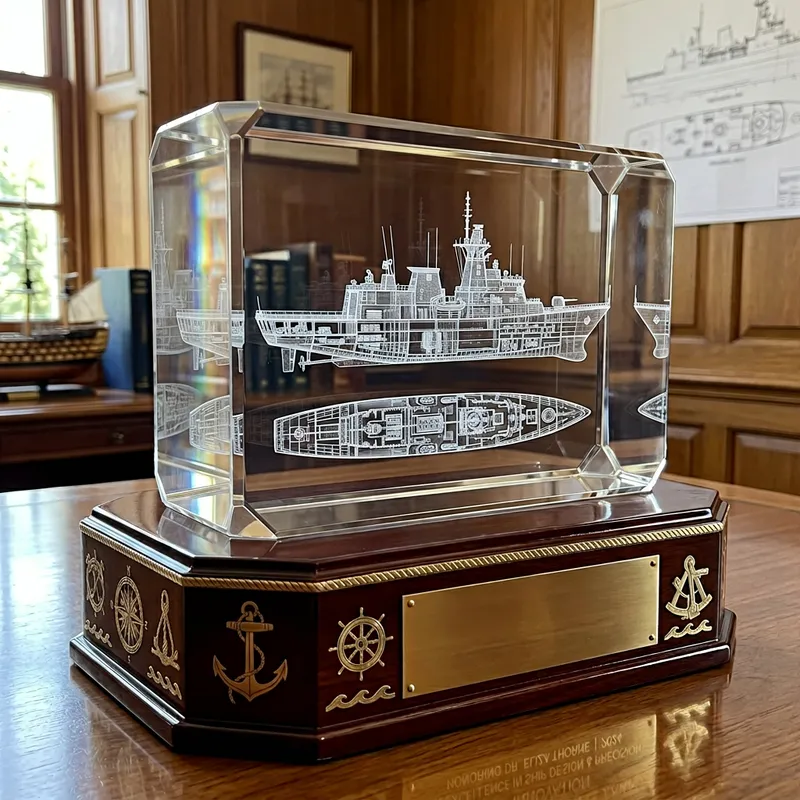 A trophy in the form of a transparent acrylic prism that has been meticulously etched with detailed blueprints of a ship. The trophy is resting on a glossy base which is embellished with various nautical symbols, including anchors and compass roses, among others. This represents the precision and innovation associated with the work of naval constructors. The see-through nature of the prism and the intricate etchings give the trophy an appearance of depth and complexity. The polished base adds a touch of elegance and sophistication to it, further emphasizing its symbolic significance.