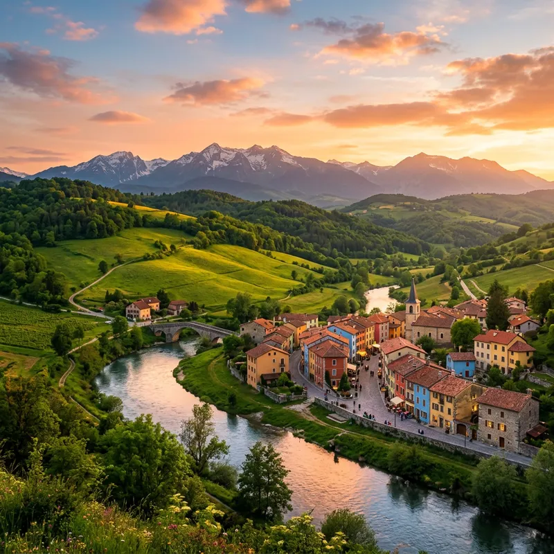 A picturesque landscape with verdant hills, a clear blue sky and a glistening river flowing through the terrain under the soft glow of the setting sun. A small town at the foot of the hills with charming, colorful houses and cobblestone streets. In the distance, a majestic mountain range kisses the horizon