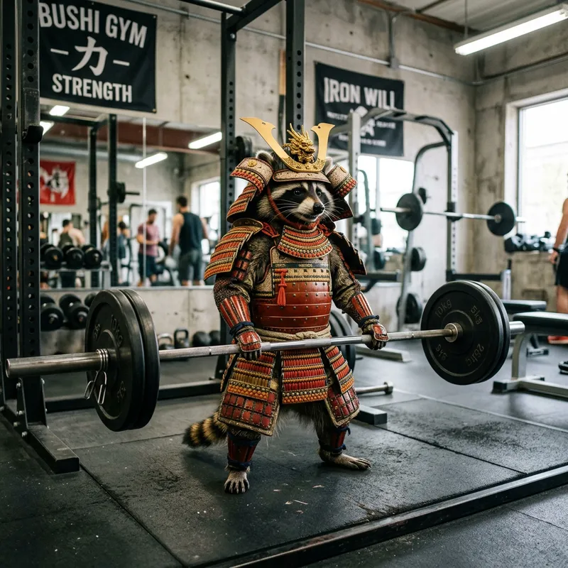 A raccoon dressed in shogun's armor, lifting weights in a gym