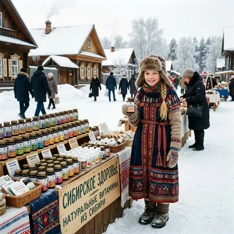 A Caucasian girl from Siberia is selling vitamins produced by the company 'Siberian Health'. She is dressed in traditional Siberian attire, standing at a small market stall with a variety of vitamin bottles arranged orderly on it. Her expression is friendly and inviting, making the scene inviting. The background is a lively street in Siberia, with small wooden houses and snow-covered ground that completes the setting.