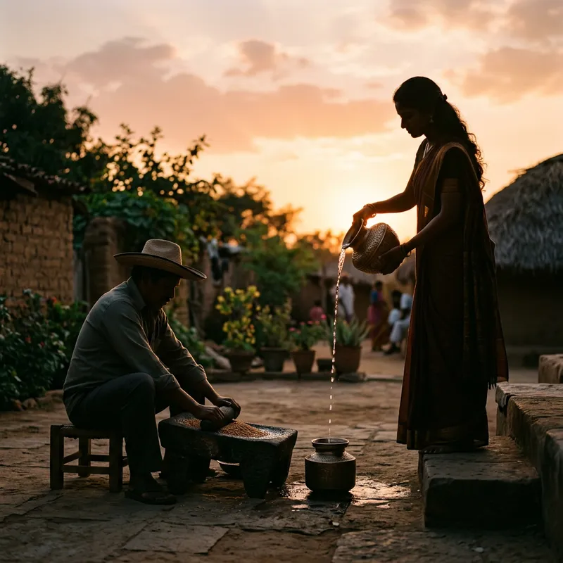 A silhouette of a woman of South Asian descent, elegantly standing and pouring water from an intricately designed urn. Not too far from her, a man of Hispanic descent is sitting comfortably, operating a traditional grindstone. They are both engaged in their tasks, portraying a peaceful arrangement between the two.