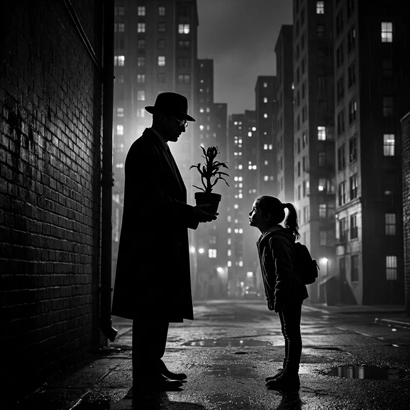 A shadowy, silhouette composition inspired by the themes of an unnamed film concerning a professional solitary man and a young girl forming a unique bond. The scene has an eerie urban backdrop full of towering buildings with dim lights. The man is depicted holding an unusual plant, while the girl, glancing up at him, shows a mix of curiosity and fear. The man's profile is assertive, highlighted by his characteristic round glasses, whereas the young girl has a ponytail, emphasizing her childlike innocence. Please note, no reference to real or copyrighted characters is intended.