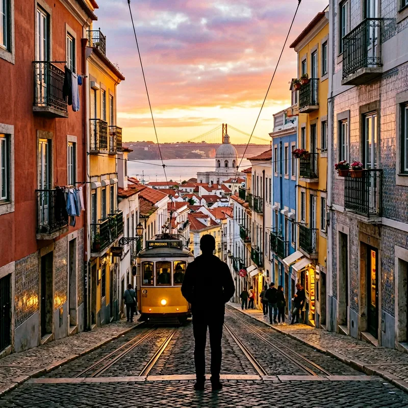 Create an image of an average silhouette standing with their back to the viewer in the city center of Lisbon. The silhouette should be wearing casual clothes. The Lisbon city center should have picturesque scenery such as bright colored buildings, narrow streets, and frequent trams. The well-kept old structures give an old-world charm to the place. The sky should be clear with a warm glow of the setting sun.