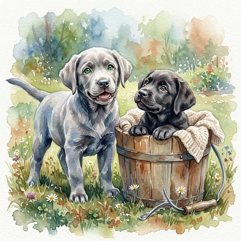 Depict a charming silver Labrador puppy with emerald green eyes, full of youthful curiosity, standing next to a bucket. Inside this bucket, there's an equally adorable charcoal-colored Labrador puppy. They're both expressing playful innocence and the joy of companionship. Represent this scene in a watercolor style, with the soft blending of colors, light transparency, and the unique texture this painting medium delivers.
