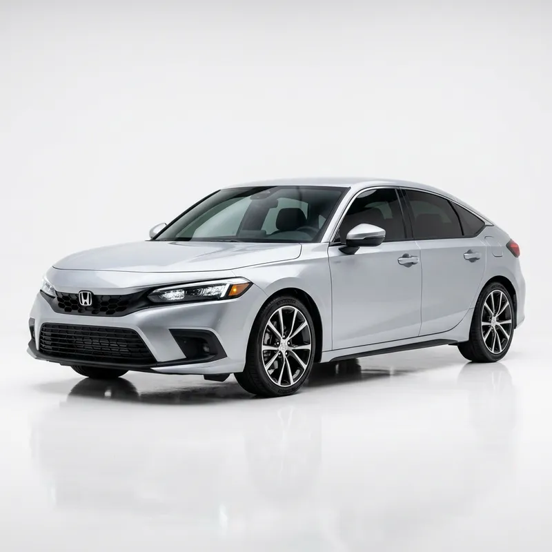A silver Honda Civic displayed against a pristine white background. Light reflects off the car's sleek and polished surface, highlighting its unique, streamlined design and intricate detailing. The car has a well-defined bumper, shiny alloy wheels, and tinted windows. It's a modern vehicle, known for its efficiency and reliability, painted in a striking silver color that enhances its elegance and sophistication.