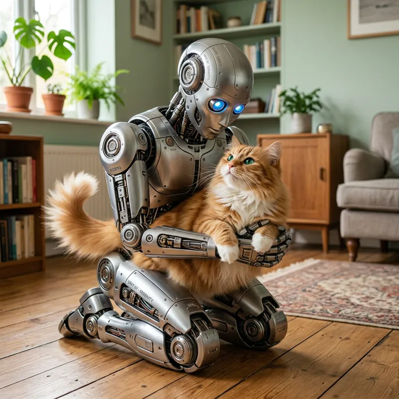 Silver Robot Holding Orange Cat in Serene Room Setting