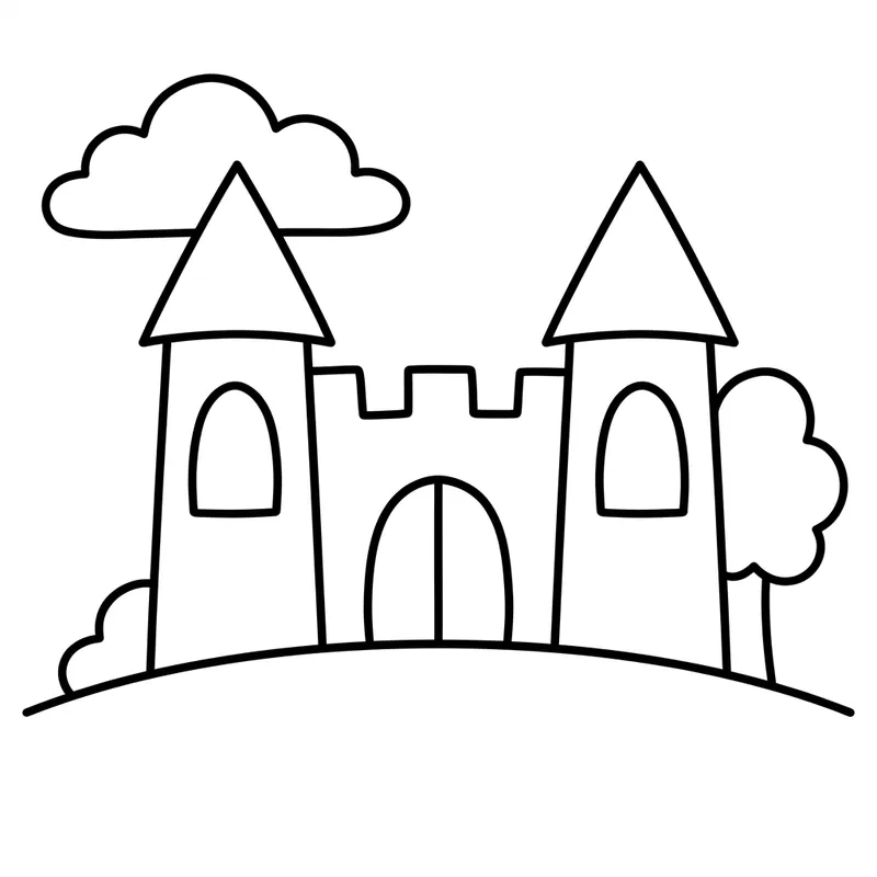 Create a coloring page designed with simple and uncomplicated black line-art. The image should feature a basic castle, tailor-made for a 1-year-old child. The castle design should be kept as straightforward as possible, with large, easy-to-color sections and minimal small details, ensuring it's easy for the child to fill in with colors.