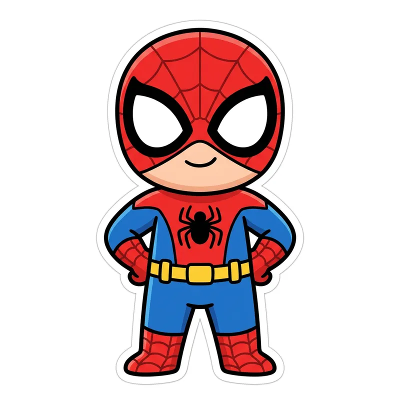 A full-bodied outline of a cute, simple superhero with some iconic elements similar to a popular spider-themed character. The image should be depicted in the style of clipart: bold lines, bright colors, and simplified shapes.