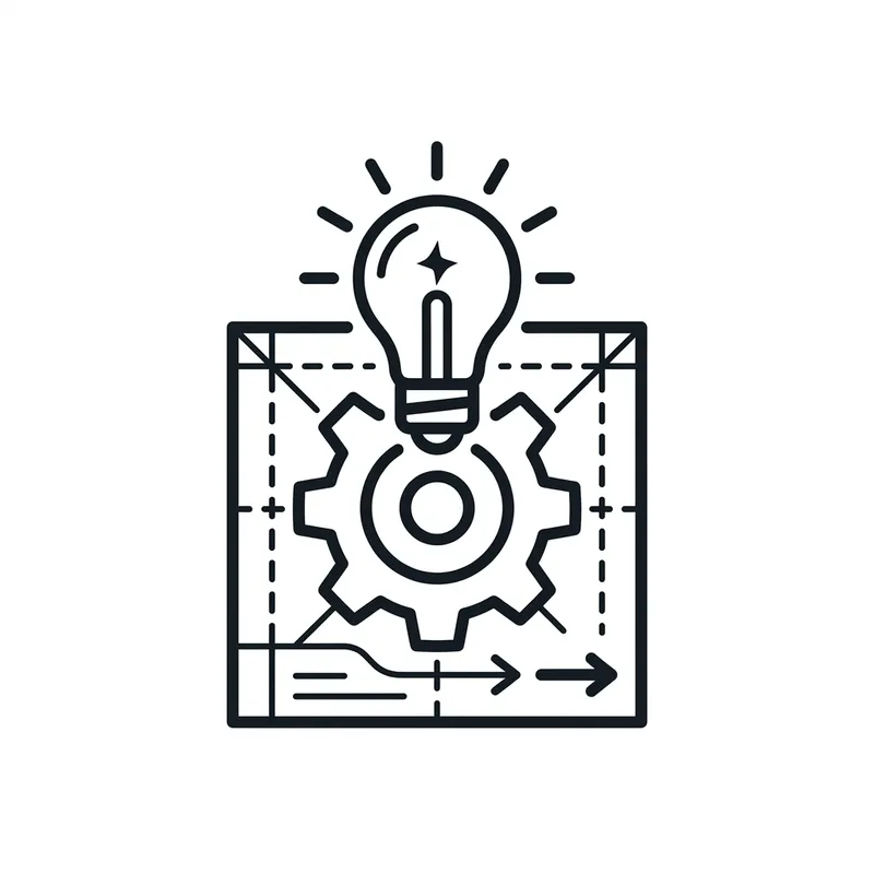 Create an icon image that symbolizes extremely simple product development. The image should feature a minimalist design that captures the essence of straightforward innovation. Include essential elements such as a light bulb for creativity, a gear for mechanical processes, and a blueprint for design planning. The overall color scheme should be monochrome to highlight simplicity.