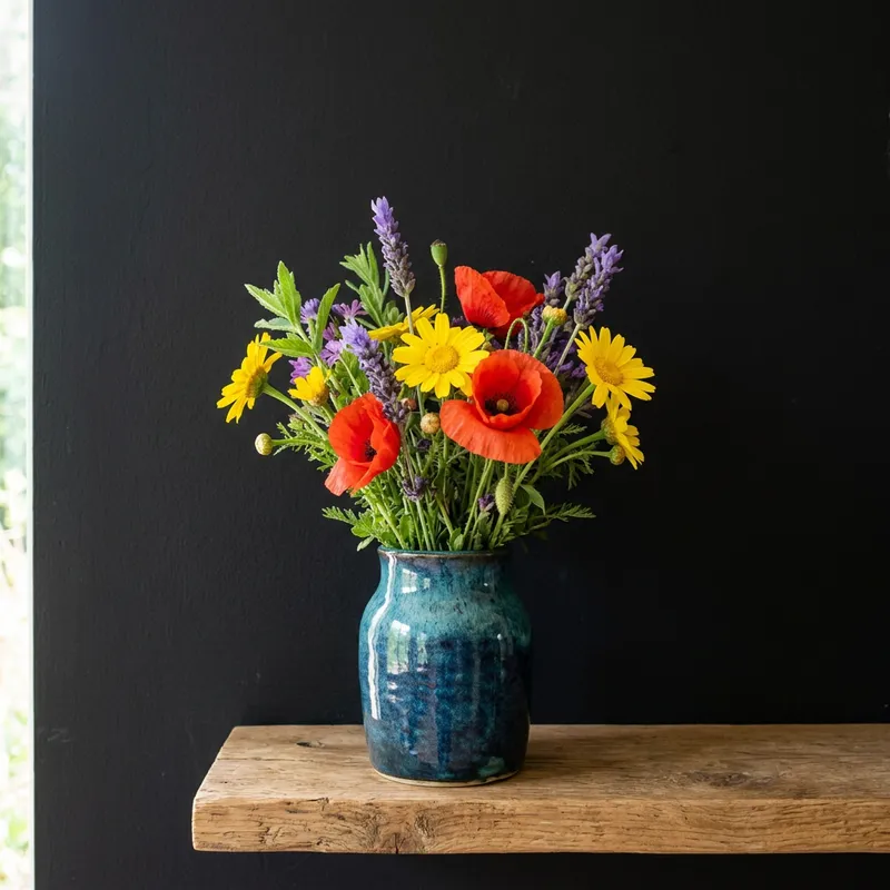 Depict a small and simple vase that is tangible and not ghostly in nature. Its vibrant flowers stand out against the stark contrast of a black wall in the background. This vase is not haunted, nor does it favor any supernatural form. Instead, it remains an earthly symbol of beauty amidst a harsh yet striking backdrop.