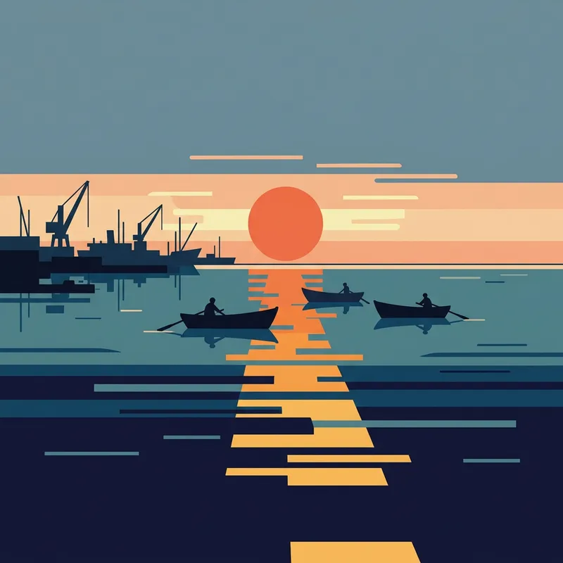 A minimalist and simplified digital artwork reminiscent of the Impressionistic era. Capture the essence of Claude Monet's painting 'Impression, Sunrise' with a limited color palette, clean lines and bold contrasts. Incorporate flat colors and minimal details with a focus on the rising sun over the water. Do not include any complex or intricate textures, instead, aim for stark simplicity.