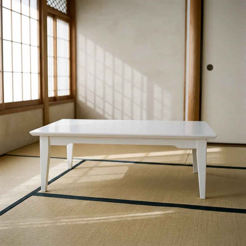 A white, simplistic Japanese style table, featuring clean lines and a minimalistic design. It stands alone, with nothing on its surface, emphasizing its bare and polished top. The room in which the table is placed is light and airy, creating an atmosphere of serene tranquility. Shadows from an unseen window add depth and texture to the scene.