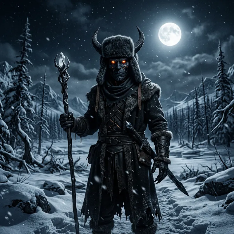 A demon character shrouded in mystery, exuding sinister vibes. This creature is sporting a distinct 'Ushanka' hat, a traditional Russian winter headgear traditionally made of fur, with side flaps that can be tied up to the crown or lowered down to provide extra warmth and protection from the cold. The hat is dark colored, almost blending with the demon's obsidian-like skin and eerie glowing eyes. The background is a desolate, chilling winter landscape under the bone-white light of a full moon.