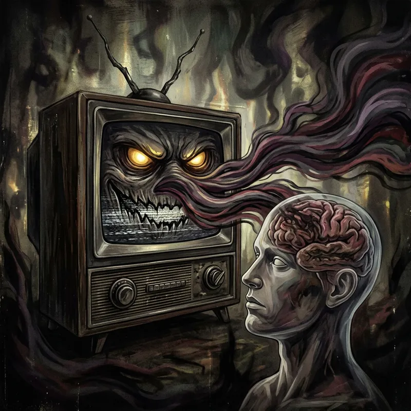 Craft a metaphoric representation of a television news network having a sinister influence over a human mind. This can be depicted by showing a large, old-fashioned television set, with malevolent facial features, projecting its broadcast into a transparent human head. The broadcast turns into waves and swirls of dark color inside the brain, symbolizing manipulation and control. The background should be vague and eerie, enhancing the overall malevolent atmosphere.