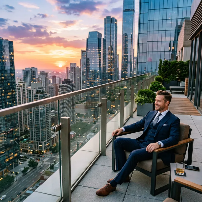 A Caucasian male on top of a skyscraper, sitting leisurely on a chair. He is well-dressed in a tailored suit, revealing a sense of urban style. The sky in the background is a rich gradient of sunset colors, with hues of orange and pink blending into the endless blue. The towering skyscrapers around him create a metallic forest of structures, their glass surfaces reflecting the vibrant skyline. He wears a content smile as he enjoys the breathtaking view and the serenity at this height, far from the bustling city life below.