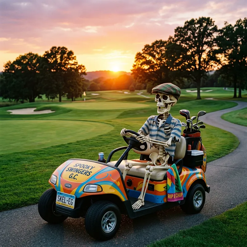Create an image of a humorously spooky skeleton with a jovial grin driving a vibrantly colored golf cart, displaying an amusing contrast between the supernatural and the mundane. The skeleton should have a driver's cap on its head. The golf cart is parked on the lush greenery of a pristine golf course, with the golden sun setting behind silhouetted trees in the background offering an enchanting glow to the scene.