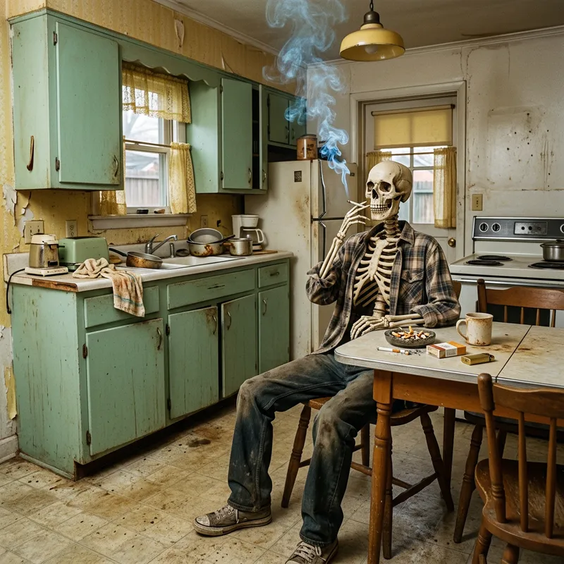 Skeleton sitting in the old shabby kitchen and smoking