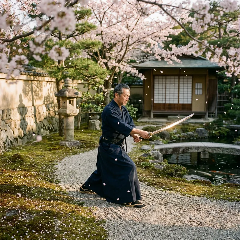 Skilled Asian Swordsman in Tranquil Cherry Blossom Garden