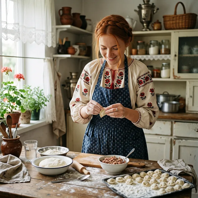 A beautiful Ukrainian woman with red hair, modestly dressed, is skillfully making small Siberian dumplings from white dough in the kitchen. The scene is cozy and inviting, with the dough being expertly shaped in her hands. Various kitchen utensils, ingredients, and a rustic wooden table imbue the image with a homely aura. Lighting falls softly over the woman and the dumplings, illuminating the process of food preparation.