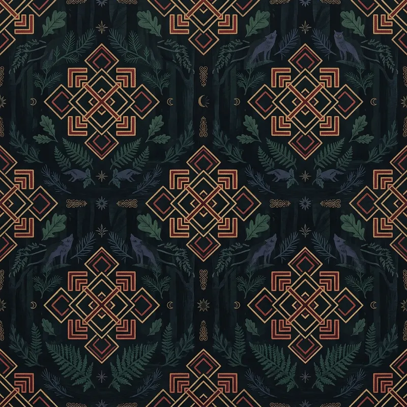 A wallpaper design inspired by Slavic artistry. The design features a forest background painted in dark, mysterious hues of black, deep green, and indigo. Imposed on the backdrop is a traditional Slavic symbol, not associated with hate or negativity, but with history and culture, creating an intriguing pattern. The symbol is defined by simple, clean lines, giving the wallpaper a balanced composition. Despite its dark color palette, the design maintains an element of serenity and natural beauty.