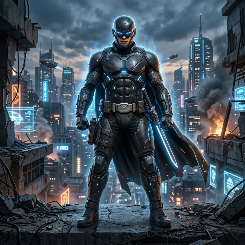 Create an image of an armored hero in a slick, futuristic armor suit with dark color shades. This hero is standing in a defiant pose, with a metallic belt around their waist and dark visor over their eyes. They have a heroic aura and a steadfast presence.