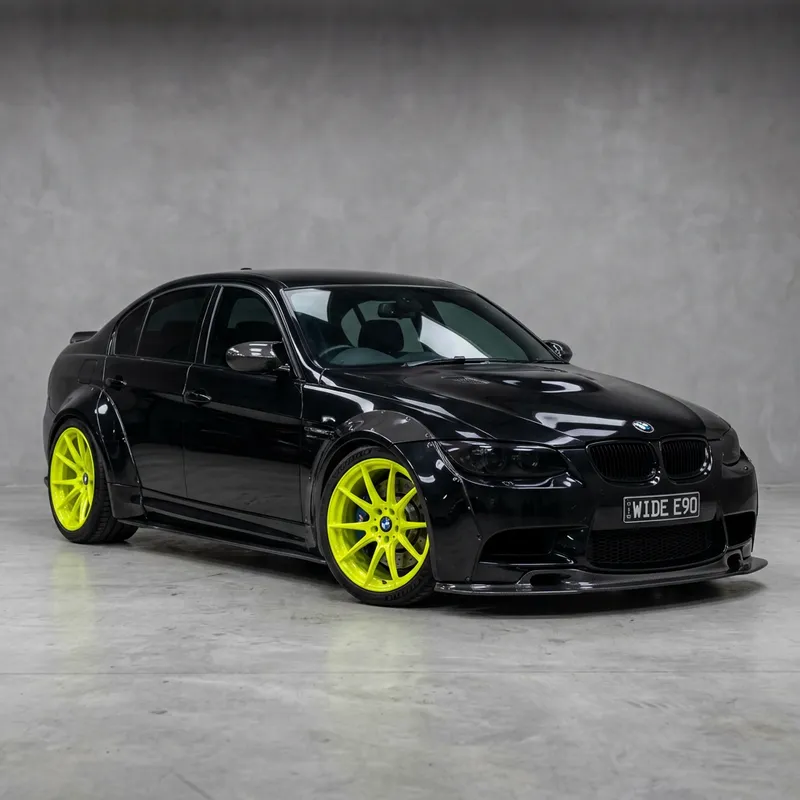 Photo of a sleek black BMW 335i E90 with a widebody modification, set against a neutral backdrop. The car is positioned in a way that showcases its pronounced wheel arches and aggressive body lines. The windows and windscreen let off a soft glint, reflecting the environment. Eye-catching custom wheels in neon yellow add a pop of color to the overall black aesthetic of the vehicle. They have a gloss finish that shines under the lighting.