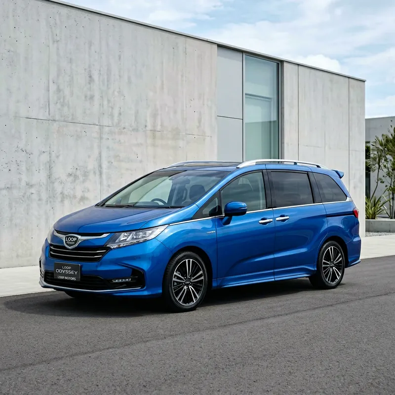 A modern minivan painted in a vibrant shade of blue. The vehicle is sleek and contemporary in design, representing the sophisticated engineering of LOOP Motors. Its spacious yet streamlined body denotes practicality and style. The vehicle features stylish alloy wheels, tinted windows, and a clean, polished finish. It is parked against a minimalistic backdrop emphasising its stand-out blue colour.