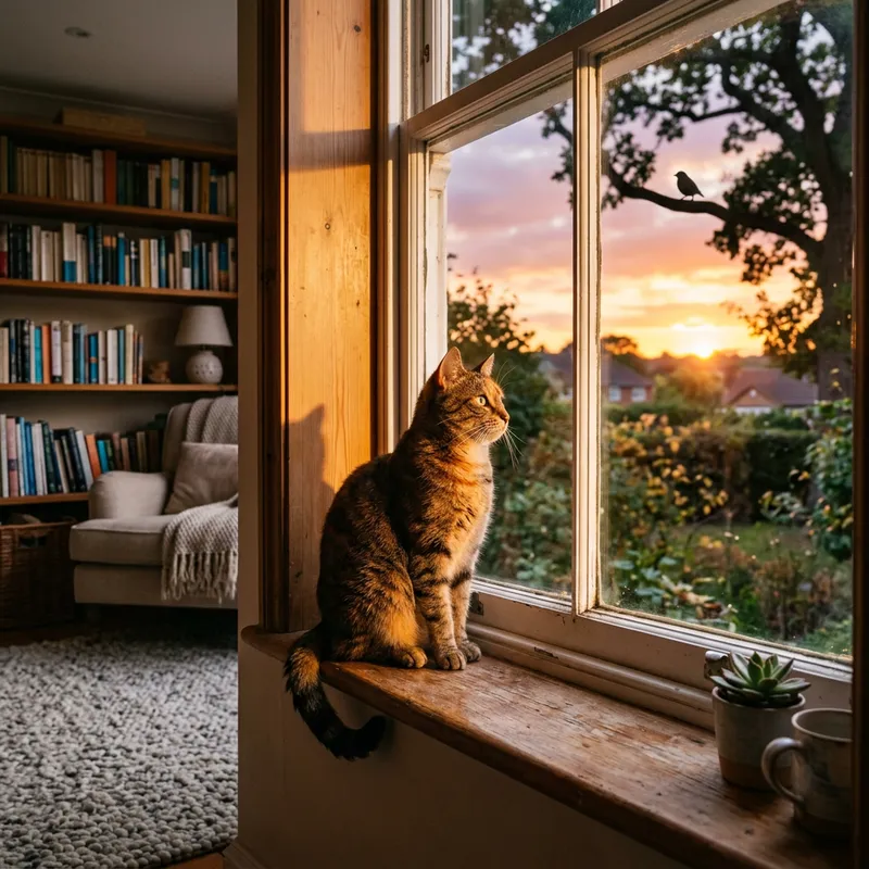 A realistic view of a cat sitting on the window sill, bathed in the soft glow of the setting sun. The cat's body is sleek and poised, its eyes are focused on a bird perched on a tree in the distance. The sun casts long shadows of the cat against the warmth of the interior, and the outside scenery painted in the shades of the sunset. In the background, a cozy room can be seen with a couch, a fluffy rug, and a bookshelf filled with books.