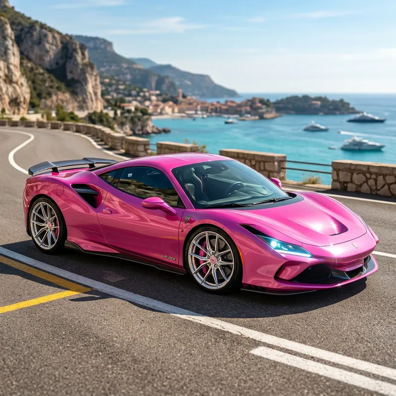 A sleek and luxurious sports car painted in a vibrant pink shade. The design of the car is characterized by smooth, flowing lines and aerodynamic features. The headlights are bright and modern-looking, and on the back, there is a stylish spoiler. The car's glossy pink color is reflecting the sunlight, giving it a shiny, mesmerizing finish. Sitting on glossy, polished alloy wheels, the car exhibits a potent mix of speed, luxury, and class.