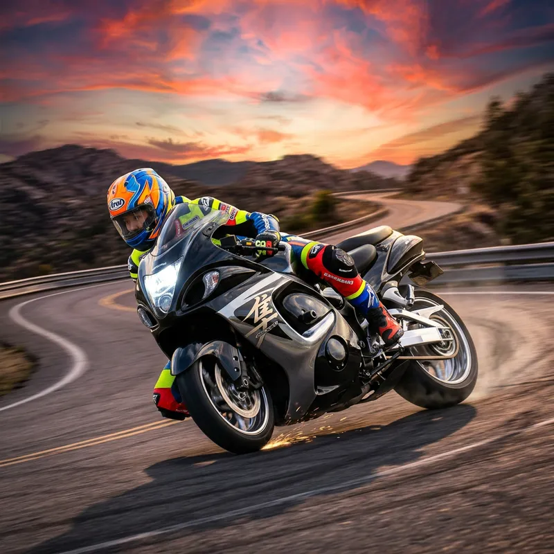 Create an intense and high-energy photo showcasing a sleek motorcycle in full speed action. The motorcycle, a combination of glossy black and gleaming chrome, is tearing down an open road, its rider precariously leaning into a sharp bend. The backdrop features a sky painted with the hues of a setting sun, casting long shadows on the road. The rider, a woman of Asian descent wearing a brightly colored helmet and matching racing leathers, is a blur of concentrated motion against this vivid spectacle.