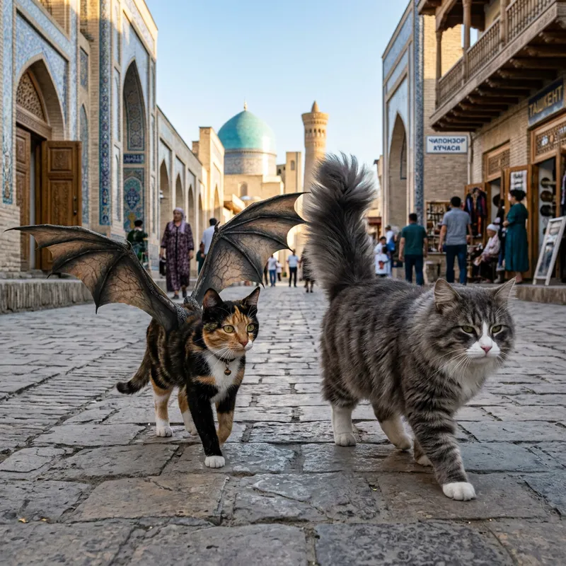 A sleek tricolor cat with dragon wings strolls down a street in Tashkent. Walking beside her is a considerably larger gray striped cat without wings. This cat has an extremely fluffy tail, white paws, and a white nose.