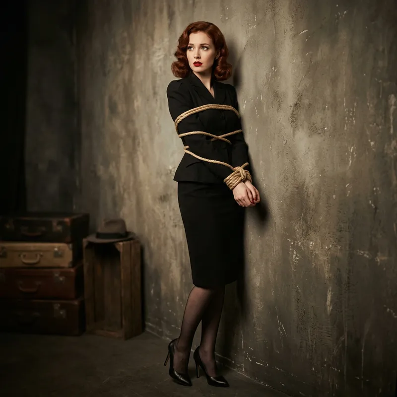 Slender red haired vintage detective style damsel in distress. Red lips, 1950's style hair, green eyes, classic bondage completely tied up with lots of rope standing against a wall. Wearing a well fitted black suit, short skirt, black pantyhose and high heels, Studio Photo.