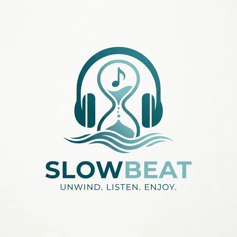 Design a sleek and modern logo for a headphone company named 'Slowbeat'. The logo should incorporate elements of music, such as music notes, headphone silhouette or sound waves, and a clock or hourglass to symbolize 'slow'. The colors should be calming and relaxing, with a tone of professionalism and creativity. Ensure the logo is clean and simple, yet impactful, emphasizing the company's dedication to quality sound and leisurely pace of enjoyment.