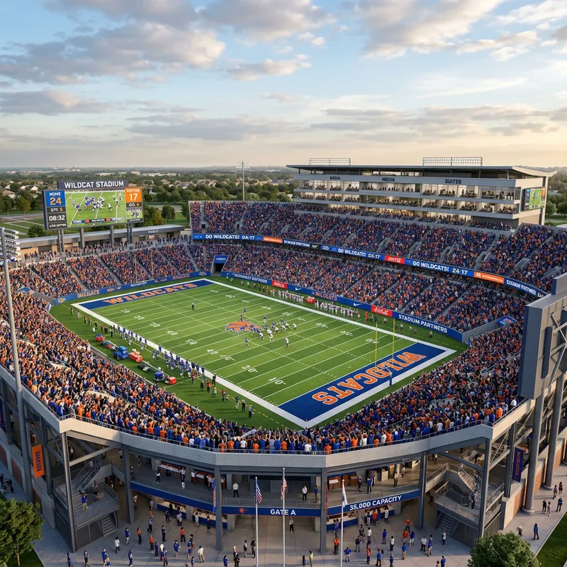 Small 35,000 seat nfl style outdoor stadium with press boxes, video ribbons and video boards.