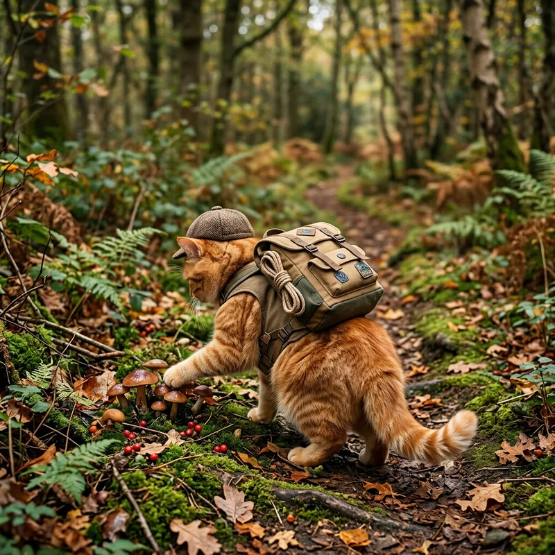 A small, plump, British, orange tabby cat from real life. It's dressed in a hiking outfit with a backpack slung over its shoulders, and a cap on its head. It's gathering mushrooms and berries. The view is from behind. Render in a style that illustrates realism, hyperrealism, and photorealism, aiming for a professional photo aesthetic that is beautiful, realistic, ultra-high resolution, and with a lot of detail.