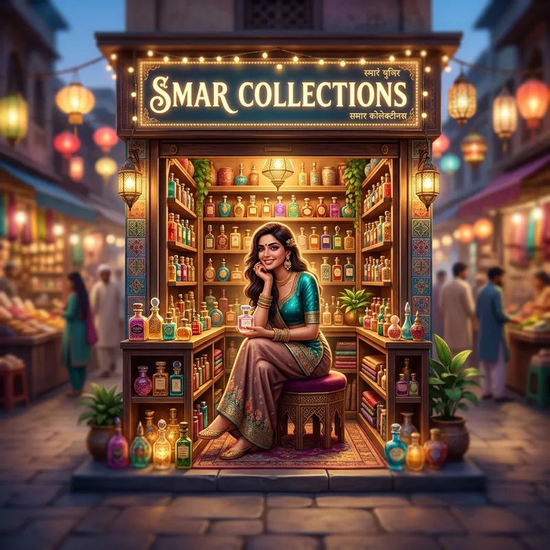 A South Asian woman sitting in a perfume storefront, featuring a 3D image with a brand name 'Smar Collections' written boldly on the storefront. The image is captured with an artistic tilt-shift lens to create a miniature effect, highlighting the vibrant colors and intricate details. She is striking a fashion-inspired pose, subtly adding to the surreal atmosphere surrounding her. The image draws heavy inspiration from the digital art style, employing luminescent airbrush techniques common within the genre, and is centered around the theme of niche fragrances.