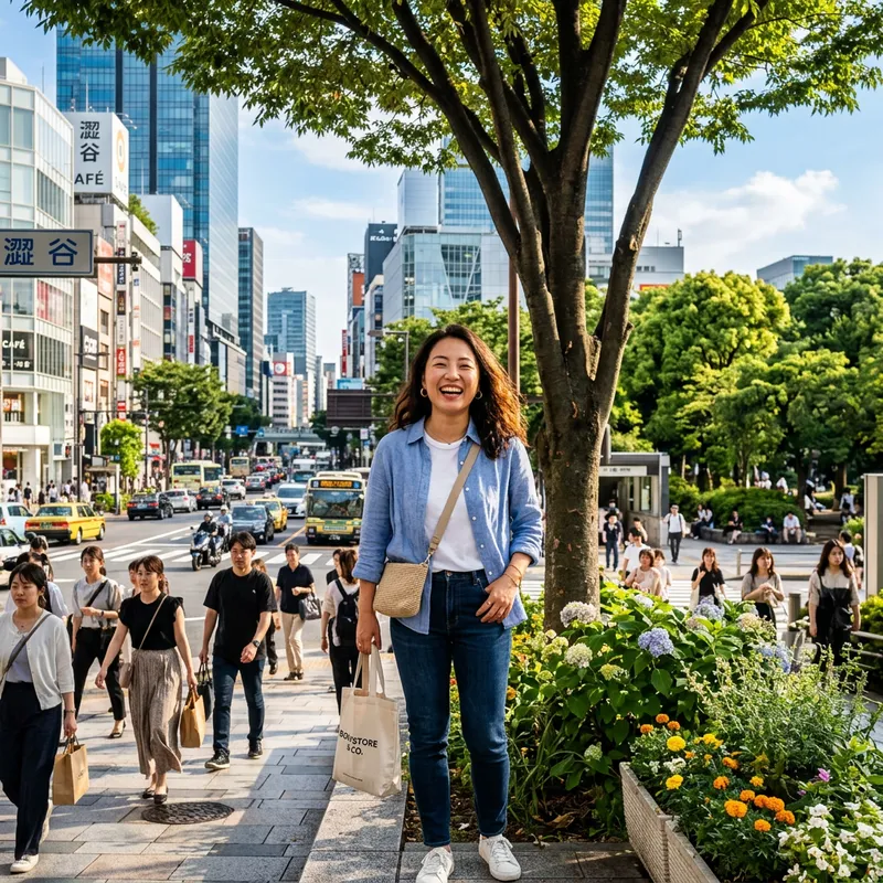 Generate an image of an Asian woman in her thirties, standing outdoors on a sunny day. She is wearing comfortable casual clothing and is smiling brightly, showing an aura of positivity and happiness. Around her is a bustling city landscape with people going about their day, tall skyscrapers kissing the sky and vehicles navigating the busy city streets. The cooling shade of a tree falls on her, the warm sun illuminates her hair and the fresh air is filled with the scent of flowers from a nearby park.