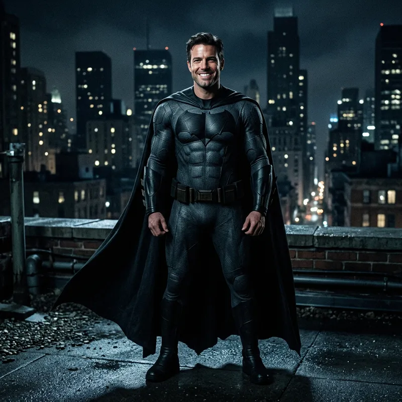 An image of a fictional superhero dressed in a long black cape, with a bat emblem on the chest of his suit standing in a dark setting. He is displaying a rare sight as he smiles radiantly, his white teeth shining through the darkness. His strong stance suggests determination and courage, and he peers ahead with a gaze as sharp as the bat emblem on his suit. Subtle cityscape silhouettes linger in the background, hinting at the metropolis he protects.