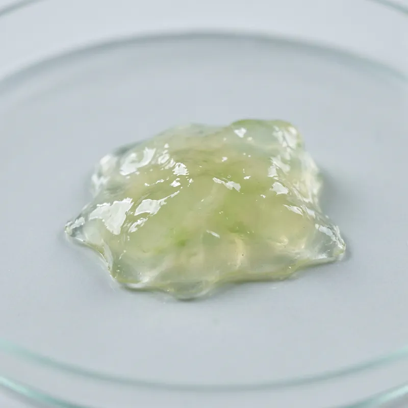 An image depicting a piece of mucus. The mucus is isolate on a clear and sterile surface. It carries a slight greenish tint and a glossy, wet texture. Visible are the uneven, irregular shape and the transparent nature of it mildly refracting the light falling on it. Noticeable are the viscosity and stickiness, typically associated with mucus. It should have a very realistic appearance.