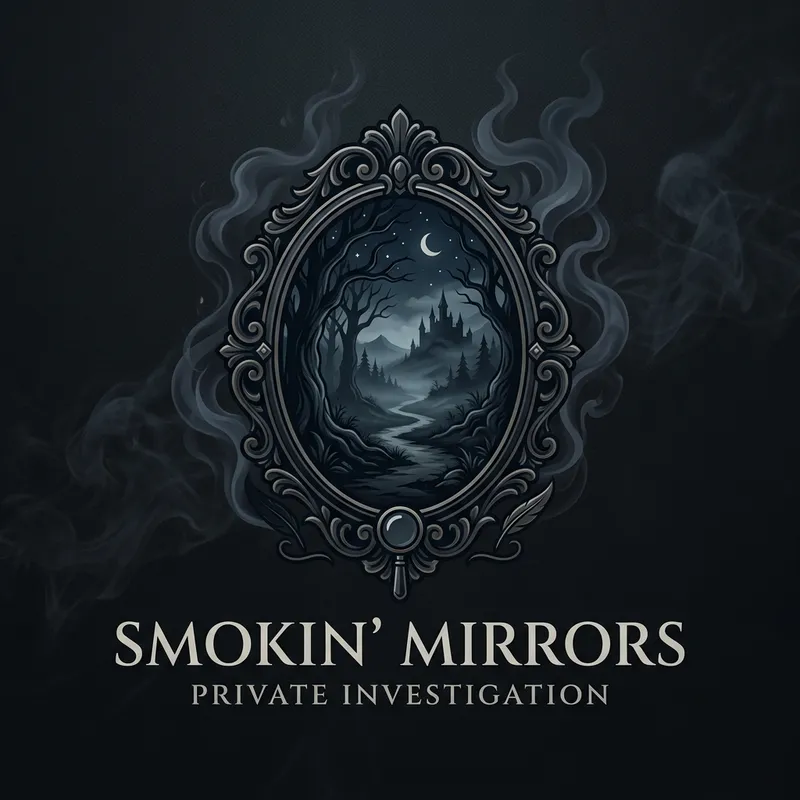 Design a company logo for a private investigation firm known as 'Smokin' Mirrors'. The logo should embody elements of mystery and mystical essence. It should incorporate hidden elements too, possibly suggestive of a concealed landscape or scene. The color palette should consist of dark and moody tones to evoke a shadowy atmosphere, and the typography should be elegant and refined, communicating a professional attitude.