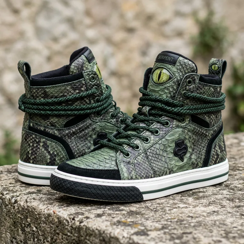 Snekeas: Green Faux-Snake High-Top Sneakers