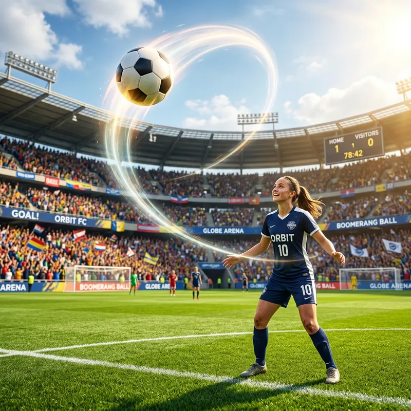 Imagine a concept of a soccer ball with a unique characteristic: It has the ability to return to its owner. This round, white and black ball, filled with air, is endowed with aerodynamic attributes that allow it to execute a loop in motion and then return to its point of origin. The grass of the soccer field creates a contrasting background while the bright sun above adds a golden glow to the flying soccer ball with the stadium stands populated by eager spectators are visible in the distance.